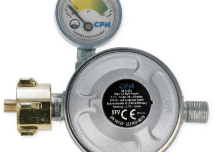 CFH Gasdruckregler mit Manometer, Füllstandsanzeige & Strömungswächter, 50mbar, 1,5 kg/h (Einsatz: Camping)