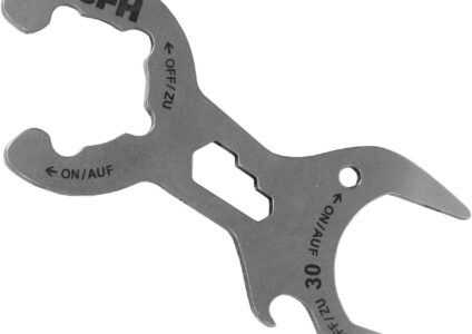 Gasflaschenschlüssel von CFH für Öffnen und Schließen der Flügel und Überwurfmutter von Gasdruckreglern. Mit Schlüsselsatz 6/8/10 mm, Flaschenöffner Technische Daten: Gewicht: 0,01 kg Länge ca.: 11,5 cm Breite ca.: 5,0 cm Höhe ca.: 0,3 cm Gewicht ca.: 51 g Material: Stahl Farben: Silber Lieferumfang: 1 Gasflaschenschlüssel