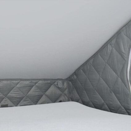 Bietet neuen Komfort für kühlere Nächte und sonnige Tage. In einem Stück montiert, bietet die Isolierung eine wahrhafte Wärmedämmung gegen Kälte und Hitze und vermeidet jedes Wärmebrückenrisiko. Die Innenseite aus grauem Polyestergewebe garantiert ein mildes Wohlfühlambiente für erholsame Nächte. Das vereinfachte Befestigungsprinzip sorgt für eine perfekte Anbringung an allen Fahrzeugen, das Montagezubehör ermöglicht eine schnelle Fixierung bei der Rast.Druckknöpfe sind an der Decke des Aufstelldaches…