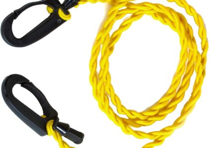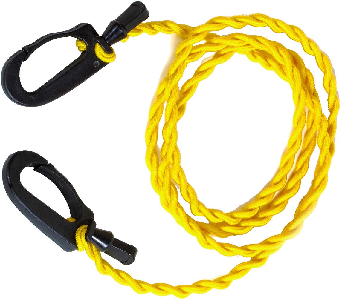Stabile Wäscheleine aus zusammengedrehten Gummiseilen und groß dimensionierten Kunststoffkarabinern. Spannen Sie die Wäscheleine zwischen Bäumen oder Stangen, im Hotelzimmer oder Caravan und klemmen Sie zwischen die Gummiseile die Wäsche und/oder alles, was aufgehängt werden soll (z. B. auch Taschenlampen, Leuchtstäbe, etc.). Länge von Karabiner zu Karabiner ungedehnt 160 cm, gedehnt bis zu ca. 350 cm. Ca. 100 g, gelbes Seil.