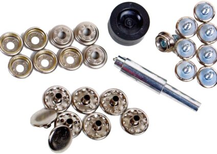 Alles, was Sie zum Hinzufügen oder Ersetzen von Druckknöpfen benötigen. Ideal für viele Heimwerkeranwendungen wie Zeltanhänger, Bootsabdeckungen, Zelte, Vorhänge und Markisen. Lieferumfang: 8 Sätze vernickelter Einschraubzapfen Bördelwerkzeug Setzsockel