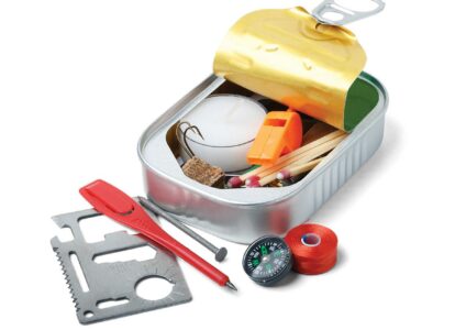 Das Survivalpaket. Verpackt in einer wasserdichten Dose (Ähnlichkeiten mit Fischdosen kommen nicht von ungefähr) findet man hier verschiedene Artikel für den Fall der Fälle. Lieferumfang: Kompass Feuerstarter Mehrzweckschnur Draht 4 wasserfeste Zündhölzer Klebeband Signalspiegel Zip-Lock Beutel 2 Nägel 2 Sicherheitsnadeln 2 Angelhaken Signalpfeife Nähnadel Briefpapier Bleistift Multifunktionskartenwerkzeug Seil Kerze Survival-/Erste Hilfe-Broschüre