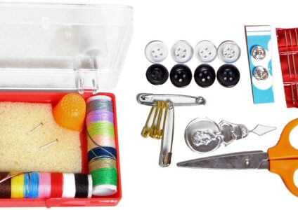 Merkmale: Farbiges Garn, 5 Nadeln, 5 Sicherheitsnadeln, Fingerhut, Schere, 8 Knöpfe, 2 Druckknöpfe und Einfädler. 8 x 6,2 x 2,2 cm, 40 g