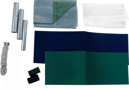 Umfangreiches Reparaturset für Nylon- und andere Synthetikzelte. Merkmale: 2 selbstklebende Nylonflicken 20 x 7,5 cm 2 Flicken Netzmaterial 2 Rollen Nylongarn (dunkelblau und dunkelgrün) 1 Nadel 3 Reparaturhülsen (Ø 8,5 / 9,5 / 11 mm , je 7 cm lang) 114 cm Elastikseil 1 x Schiebeverschlussbeutel