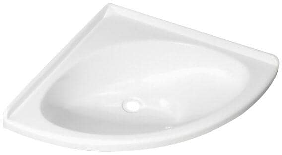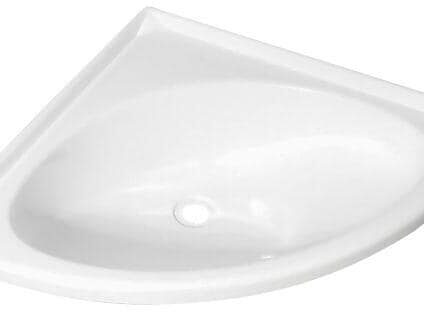 Eckwaschbecken maxi, weiß-glänzend. Ablauf: 3/4 Technische Daten: Abmessungen (BxTxH): 420 x 420 x 160 mm Ausschnitt Nennmaß: 430 x 270 mm Muldentiefe: 170 mm Material: PS Polystyrol Gewicht: 636 g