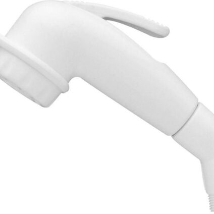 Kunststoff-Stellbrause 2-teilig Vorderteil ½“ Außengewinde mit abschraubbarem Winkel 3/8“ Außengewinde. Funktion: Dauerlauf/Impuls/abstellbar. Passend für alle Brauseschläuche mit Konus ½“, Überwurfmutter ½“, Überwurfmutter 3/8“.