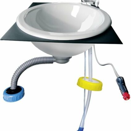 Besteht aus Wasserhahn, Waschbecken und 12-Volt-Pumpe sowie einer Vorbereitung für Zu- und Ablauf aus handelsüblichen DIN 96 Weithalskanistern bis 19 Liter. Das Set kann bei dem 1- und dem 2-Tür Schrank eingesetzt werden. Technische Daten: Beckenmaße: Ausschnitt 300mm Außendurchmesser: 360mm Tiefe: 140mm Nettogewicht: 1 kg Lieferumfang: 1 Kunststoffbecken 1 Tauchpumpe 1 Wasserhahn 1 Frischwasserschlauch mit Verschraubung 1 Abwasserschlauch mit Verschraubung Kleintiele 12 V Anschluss mit Stecker