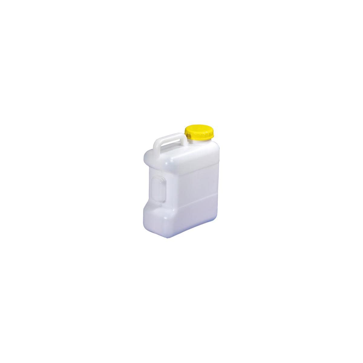 Weithalskanister mit Deckeldepot, mit Deckelsicherung an der Seite und mit integriertem Tragegriff, ohne Auslaufhahn. Technische Daten: Inhalt: 10 l DIN: DIN 96 Material: HDPE (Hart-Polyethylen) – dadurch BPA-frei Maße (B x T x H): 140 × 270 × 350 mm Gewicht: 600 g