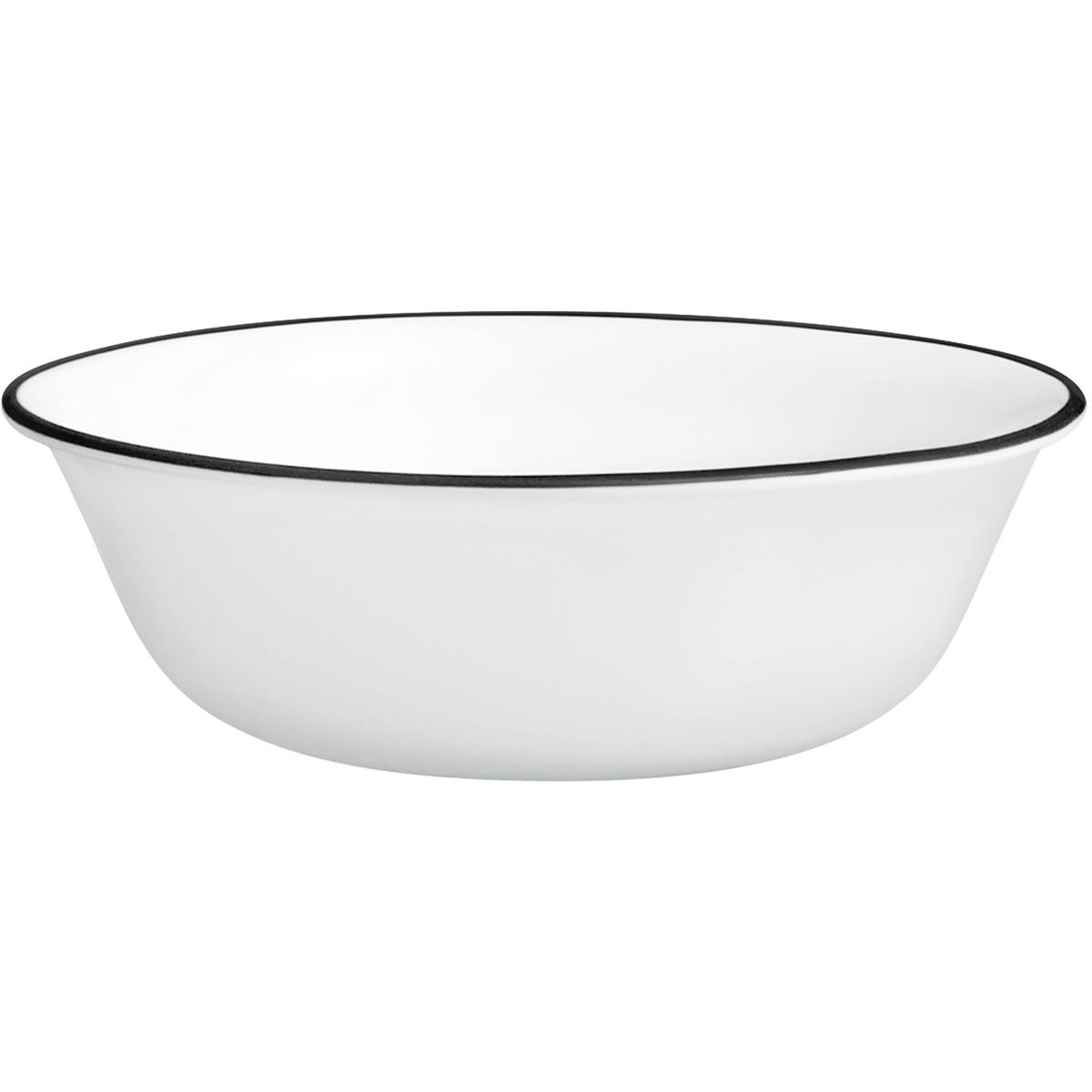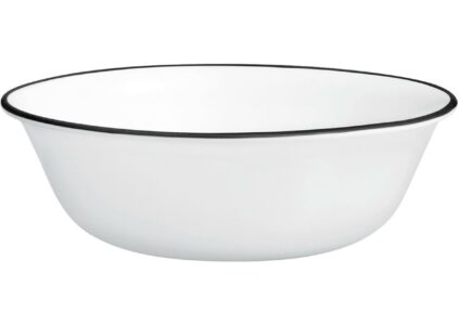 Einfache Müslischale mit schwarzem Rand. Hergestellt aus dreischichtigem Vitrelle Spezialglas. Resistent gegen Absplitterungen, Bruch sowie Kratzer. Das Vitrelle Glas-Geschirr von Corelle ist 3 Mal widerstandsfähiger als herkömmliches, traditionelles Keramikgeschirr. Ultra robust und stapelbar für mehr Platz im Schrank. Ofen- und Mikrowellengeeignet Spülmaschinengeeignet Technische Daten Maße: Ø 15,8 cm, H 4,8 cm Gewicht: 180 g Farbe: weiß/schwarz Material: Vitrelle