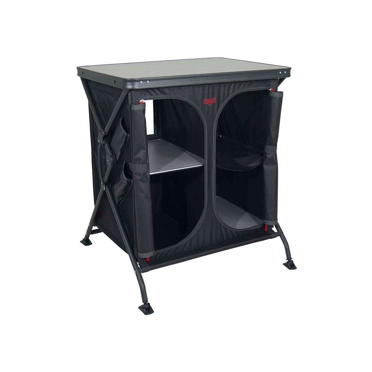 Ein sehr stabiler Faltschrank mit 2 Einlegeböden, der sich mit einem Handgriff leicht aufstellen lässt. Dank dieses einzigartigen Systems ist dieser Kochschrank schnell aufzubauen, sehr flach zusammenklappbar und leicht zu verstauen. Der Faltschrank verfügt über eine hitzebeständige und wasserfeste Melaminplatte und einen schwarzen Aluminiumrahmen. Die Hülle besteht aus extra stabilem 400D Polyester. Die verstellbaren Beine mit selbstnivellierenden Stabilisatoren sorgen dafür, dass der Kochschrank auf…