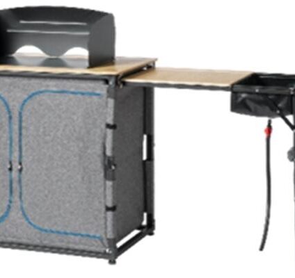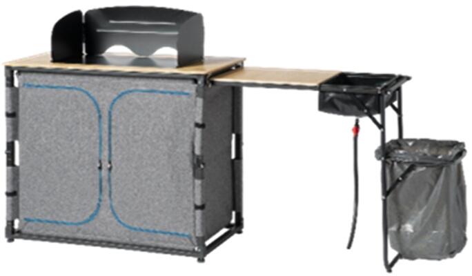 Dieser hochwertige Küchenschrank vereint Funktionalität und modernes Design mit einer robusten Bambusplatte und mit Aluminium ausgekleideten Regalböden.mit großer Bambusarbeitsplatte und AblagefächernSpüle und zusätzliche Arbeitsfläche sind ausziehbarmit WindschutzSpüle aus PVC mit SchlauchSeitlicher Aluminiumrahmen für Müllbeutel