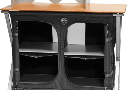 Dieser schnell und leicht aufzubauende Küchenschrank mit klappbarem Außengestell und in grau gehaltenem Bezug besitzt eine robuste Arbeitsplatte aus 10 mm starkem Bambus. Ergänzt durch den im Lieferumfang enthaltenen Windschutz kann darauf gekocht werden. Die Innenfächer können durch Herausnahme der 4 mit Aluminiumkante verstärkten Regalböden individuell dimensioniert werden, eine rückseitig eingenähte Gaze dient der Belüftung. Eine Trage- und Aufbewahrungstasche ist im Lieferumfang enthalten. schnell…
