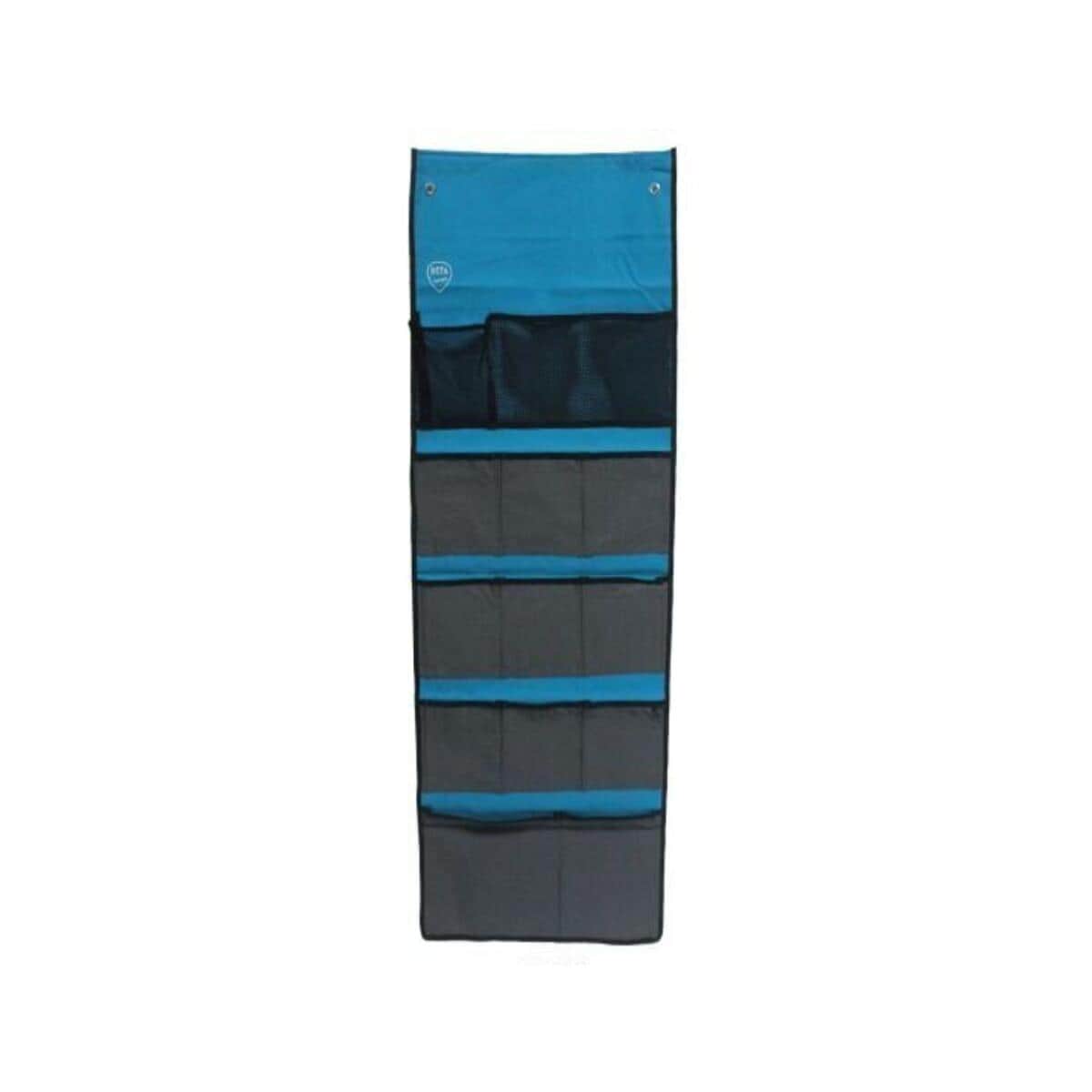 Organizer mit 14 Taschen und Zeltschienen-Schnur zum einfachen Aufhängen. 2 Aufhängeösen und Klettband zur Rahmenbefestigung Technische Daten: Material: 100 % Polyester Maße: 60 x 160 cm (B x H) Gewicht: 0,65 kg Farbe: aqua
