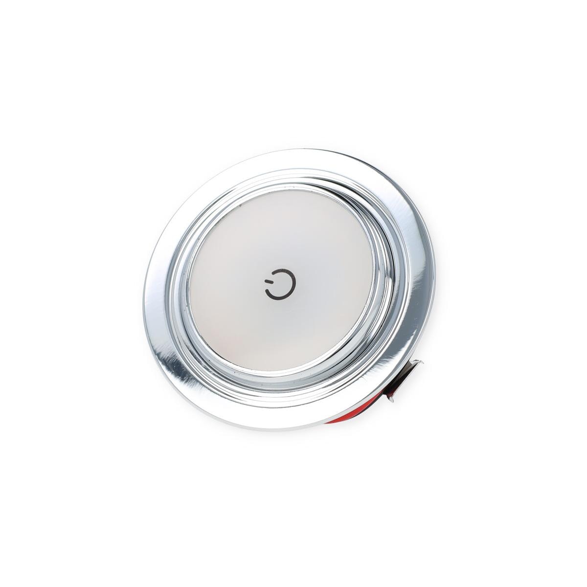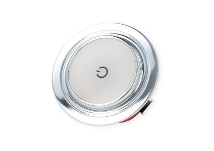 Beweglicher LED Einbaustrahler mit Milchglas, diffusem Licht und integriertem Touch-Schalter Technische Daten: Lichtfarbe: 3000 K Nennspannung: 12 V Nennleistung: 1,2 W Gewichteter Energieverbrauch [kWh/1000h]: 1 Energieeffizienzklasse: G Farbe: Chrom Höhe: 20 mm Durchmesser: 68 mm Montagebohrung: 52 mm Gewicht: 70 g