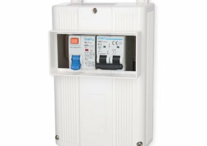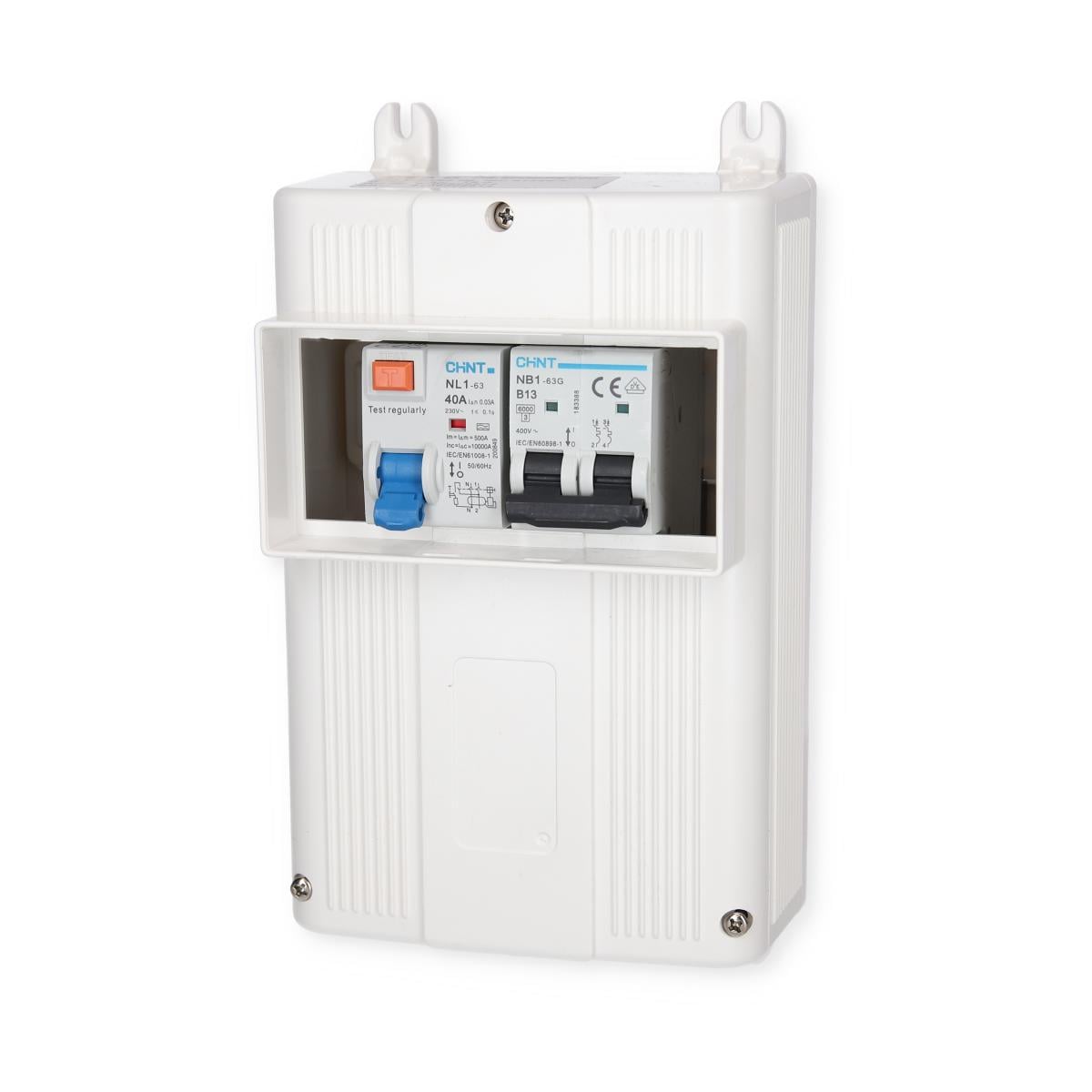 Sicherungskasten – 2-poliger 13 A Sicherungsautomat, 40 A/30 mA FI-Schutzschalter schwer entflammbares Gehäuse horizontaler und vertikaler Einbau möglich für Dauerbetrieb zugelassen Nur im Innenraum verwendbar Technische Details: Eingangsspannung: 230 V Eingangsfrequenz 50 Hz Nennstrom: 40 A Farbe: weiß Maße (B x T x H): 13,5 × 23,5 × 9,5 cm Gewicht: 820 g