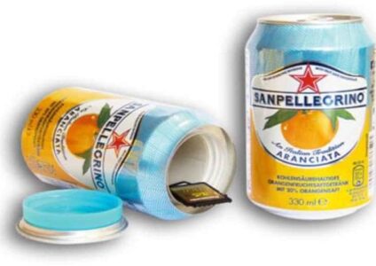 Unscheinbar, weil aus echter Getränkedose (0,33l) hergestellt. Auch das Gewicht kommt einer gefüllten Dose verblüffend nahe. Eingelassener Tresorbehälter mit 100ml Fassungsvermögen, Spritzwassergeschützt. Produktmaß: H11,5 x Durchmesser 6cm