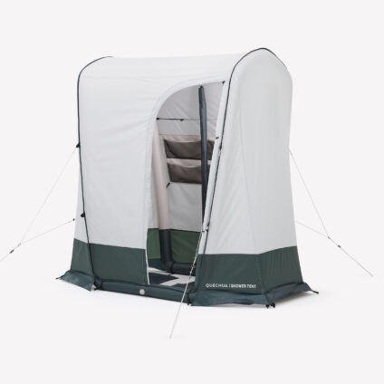 Ein 2,5 m² großes Camping-Duschzelt, das in mehrere Bereiche unterteilt werden kann: Dusche, Waschbecken, Trockentoilette und Stauraum. Lässt sich kompakt in ein Fahrzeug verstauen. Geräumigkeit::Maximale Höhe: 204 cm | Bodenfläche: 2,5 m², bequem für bis zu 2 Personen|Einfacher Auf- und Abbau::Sehr schneller Aufbau dank aufblasbarem Komplettsystem | Druck 7 PSI|Wärmereduzierung::Seitentür mit RV | Verschließbares Meshfenster | Dach zum Öffnen. Fresh-Gewebe.|UV-Schutz::Das Außenzeltgewebe filtert UV-Strahlen mit Lichtschutzfaktor 50+.|Wasserdichtigkeit::Wassersäule (Schmerber): einwandiges Dach > 2.000 mm|Windwiderstandsfähigkeit::Windstabil bis 60 km/h (Stärke 7) | Im Windkanal getestet.|Einfacher Transport::Rechteckige Hülle | 84 × 20 × 20 cm | 64 Liter|Gewicht::Gesamtgewicht: 7,5 kg
