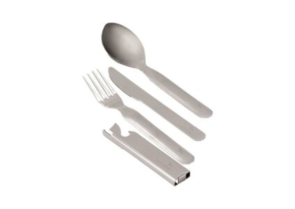 Deluxe Reisebesteck Set von Easy Camp. Das Kit besteht aus einem Messer, einer Gabel und einem Löffel, die alle im kleinen Halter montiert werden können, der gleichzeitig als Öffner und Dosenöffner fungiert. Technische Daten Material: Edelstahl Farbe: grau Lieferumfang: Messer Gabel Löffel Flaschenöffner Dosenöffner