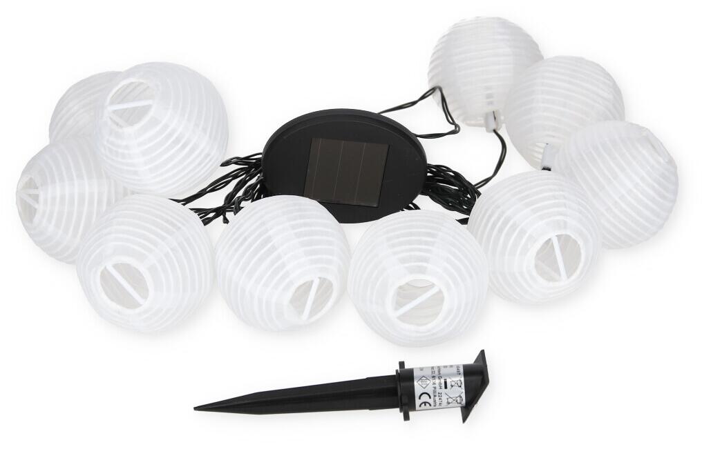 Diese Solarlichterkette in Lampions-Optik in der Farbe Weiß spendet warmweißes Licht und bringt ein gemütliches Flair in Ihren Garten.Technische Daten:Spannung: 1,2 VLeistung: 0,06 WSchutzart: IP44Schutzklasse: IIIAnzahl Flammen: 10Material: KunststoffHöhe: 10,5 cmDurchmesser: 7 cmLänge: 430 cmFarbe: weiß, schwarzGewicht: 0,16 kg