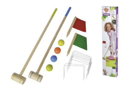 Beinhaltet 2 x 65 cm große Schläger, 4 Bälle mit Ø 50 mm, ein Start- und ein Ziel-Stab sowie 10 Tore zum Aufstellen. Super leicht und schnell auf der Wiese aufgebaut und spielbereit. Achtung! Nicht geeignet für Kinder unter 3 Jahren. Technische Daten: Gewicht: 0,677 kg Material: Schläger Holz, Bälle Kunststoff Maße: Schläger 65 cm lang, Bälle Ø 50 mm Lieferumfang: 1 Krocketset