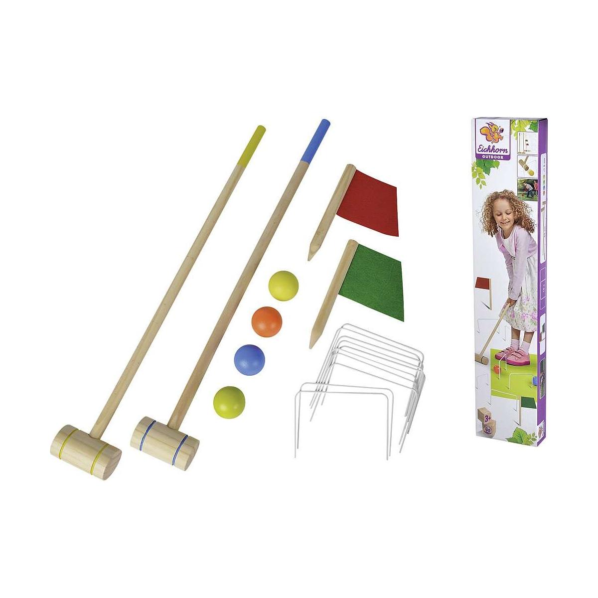 Beinhaltet 2 x 65 cm große Schläger, 4 Bälle mit Ø 50 mm, ein Start- und ein Ziel-Stab sowie 10 Tore zum Aufstellen. Super leicht und schnell auf der Wiese aufgebaut und spielbereit. Achtung! Nicht geeignet für Kinder unter 3 Jahren. Technische Daten: Gewicht: 0,677 kg Material: Schläger Holz, Bälle Kunststoff Maße: Schläger 65 cm lang, Bälle Ø 50 mm Lieferumfang: 1 Krocketset