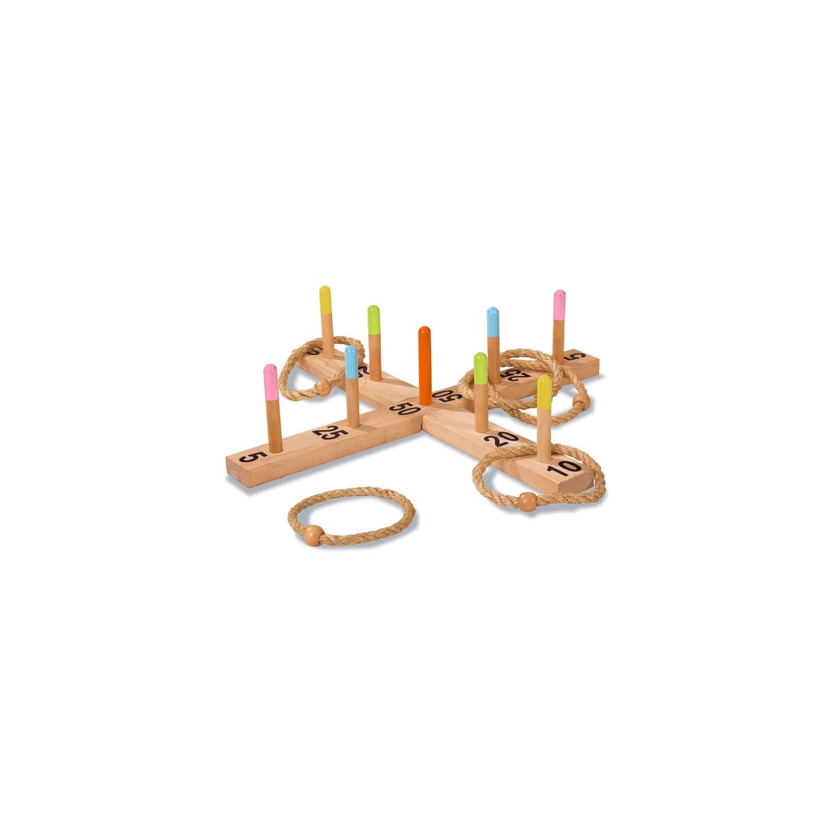 Das Eichhorn Ringwurfspiel aus hochwertigem Holz ist ein cooles Geschicklichkeitsspiel für den Garten. Das Kreuz mit den 9 Pins wird auf den Boden gelegt. Aus einer festgelegten Entfernung müssen die Ringe über die Pins geworfen werden. Jeder Pin bringt unterschiedlich viele Punkte. Wer am meisten Punkte erzielt, hat gewonnen. Geschicklichkeitsspiel aus Holz mit 5 Ringen ca.12 cm und 9 Spielstäben Technische Daten: Kreuz: 50 x 50 cm Material: Kiefernholz Altersempfehlung: ab 3 Jahren