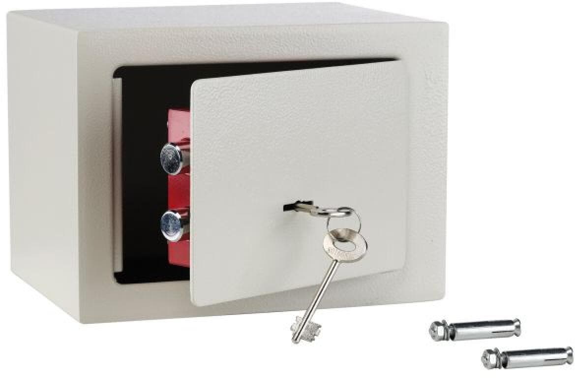 Weißer Safe mit 2 Schlüsseln, Tür- und Wanddicke 3/1 mm, Befestigung an Wand und Boden möglich. Technische Daten: Material: Metall Breite: 23 cm Höhe: 17 cm Tiefe: 17 cm Nettogewicht: 12,5 kg Packmaß: 25 x 20 x 20 cm