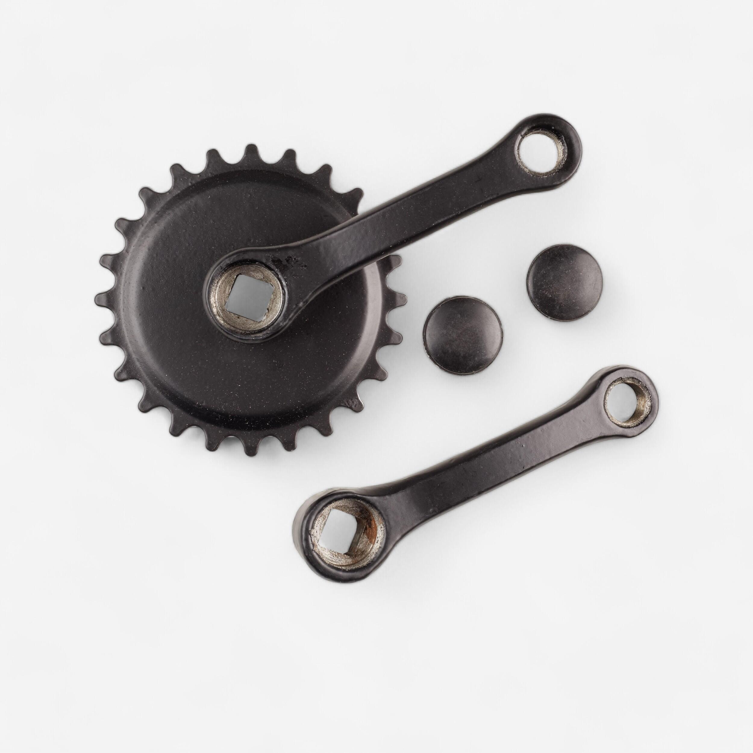 Diese Einfach-Kurbelgarnitur ist mit einem Kettenblatt mit 24 Zähnen und Kurbeln mit 100 mm Durchmesser ausgestattet. Reparatur::Für die Reparatur deines Sportgerätes!|Kompatibilität::Kompatibel mit 16“-Kinderfahrrädern