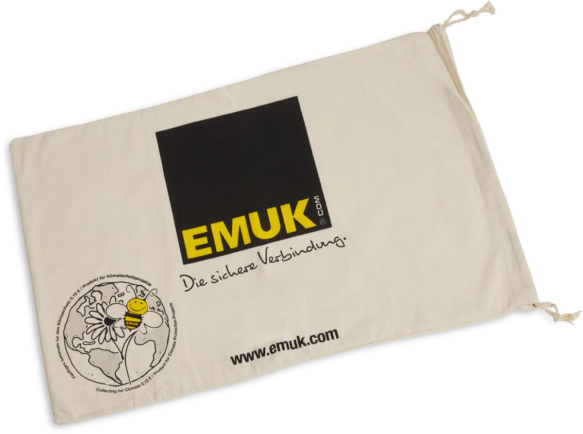 Sicherer und sauberer Aufbewahrungsbeutel für EMUK Air-Lift Ausgleichkissen. Auch für Spezial-Spiegel verwendbar. mit Zuziehkordel Logodruck EMUK Technische Daten: Material: recycelte Baumwolle natur, 220g/m², mit Trennstoff Maße: 350 x 650 mm