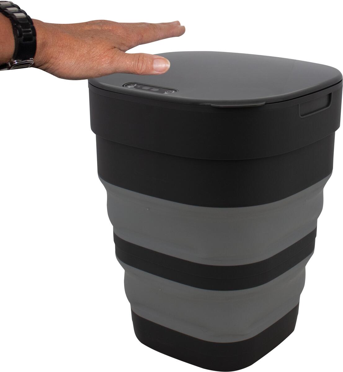 Praktischer faltbarer Abfallbehälter mit Infrarot-Bewegungssensor. Dadurch wird sichergestellt, dass sich der Eimer automatisch öffnet und nach 5 Sekunden wieder schließt, sobald Sie Ihre Hand 20 cm vom Eimer entfernt halten. Ideal zum Camping, Bootfahren oder sogar zu HauseTechnische Daten:Material: ABS, PP, TPRAbmessungen: 25 x 25 x 30,5 cm,Volumen: 8,5 LGefaltet: 25 x 25 x 11,5 cmBatterie: 2 AA-Batterien (nicht im Lieferumfang enthalten)Farbe: schwarz, grau