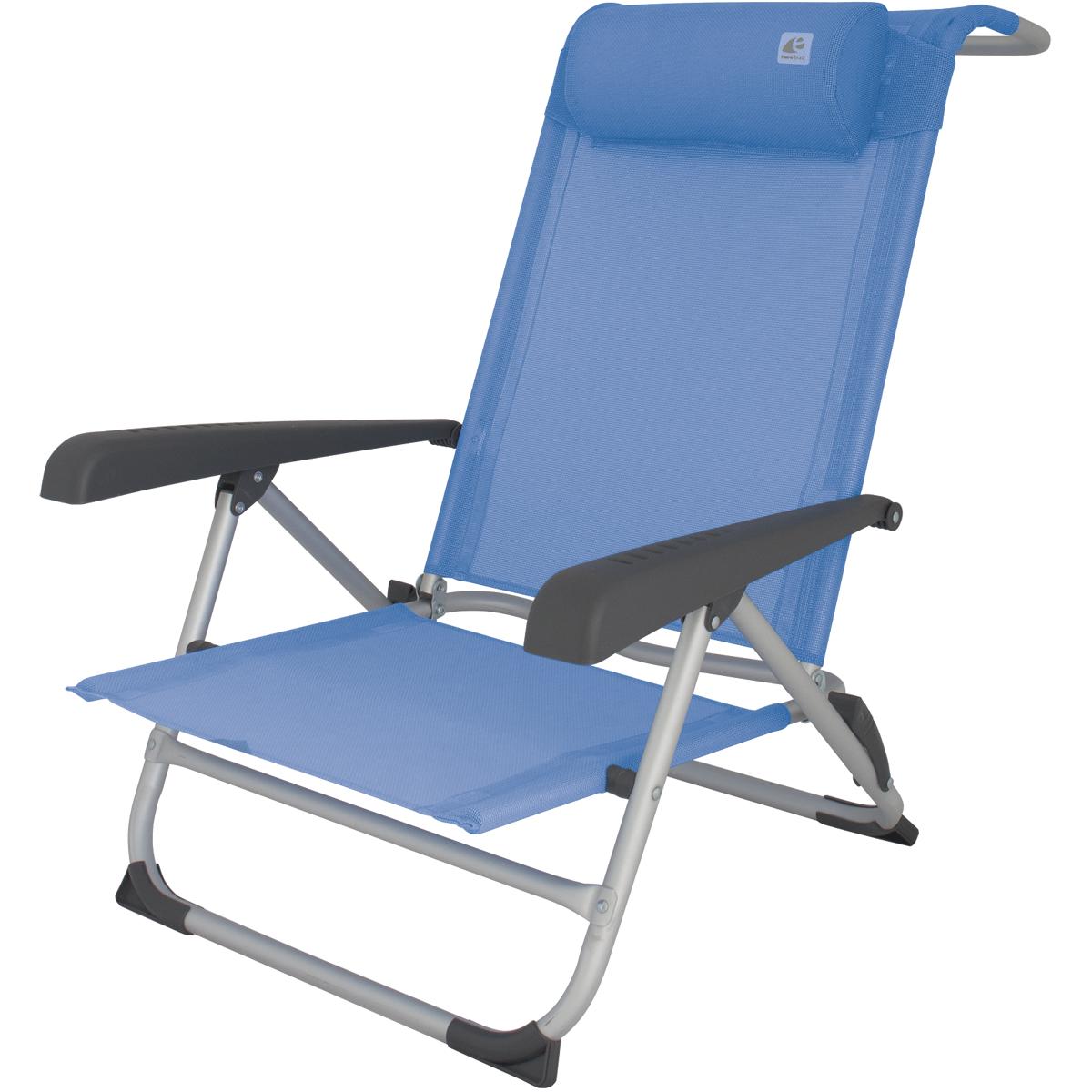 Komfortabler Strandstuhl mit verstellbarer Rückenlehne und breiten Armlehnen. Die Rückenlehne kann nach hinten geklappt werden. Ideal für den Einsatz am Strand oder auf dem Campingplatz. Technische Daten: Bezug: Textilene 70% PVC 30% PES Gestell: Aluminium Rundrohr Größe: 60 x 55 x 20/74 cm Packmaß: 77 x 56 x 21 cm Gewicht: 2,4 kg Max. Belastung: 100 kg Farbe: kobaltblau