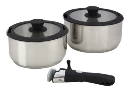 Luxuriöses Kochtopfset aus Edelstahl mit Silikonkanten-Glasdeckel. Die Töpfe sind ineinander stapelbar und mit einem abnehmbaren Griff ausgestattet, sodass sie fast überall aufbewahrt werden können. Der spezielle Griff lässt sich durch ein einzigartiges Klicksystem einfach abnehmen und sorgt für einen stabilen Halt. Durch den abnehmbaren Griff sind die Töpfe auch für den Backofen geeignet. Auf der Innenseite der Kochtöpfe befindet sich eine praktische Graduierung, damit Sie die Füllmenge genau ablesen…