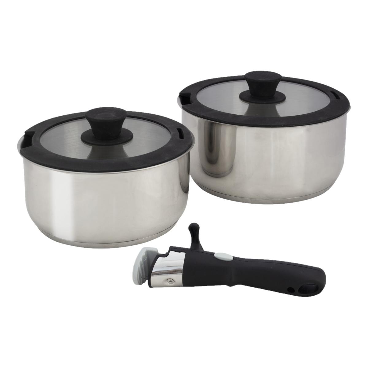 Luxuriöses Kochtopfset aus Edelstahl mit Silikonkanten-Glasdeckel. Die Töpfe sind ineinander stapelbar und mit einem abnehmbaren Griff ausgestattet, sodass sie fast überall aufbewahrt werden können. Der spezielle Griff lässt sich durch ein einzigartiges Klicksystem einfach abnehmen und sorgt für einen stabilen Halt. Durch den abnehmbaren Griff sind die Töpfe auch für den Backofen geeignet. Auf der Innenseite der Kochtöpfe befindet sich eine praktische Graduierung, damit Sie die Füllmenge genau ablesen…