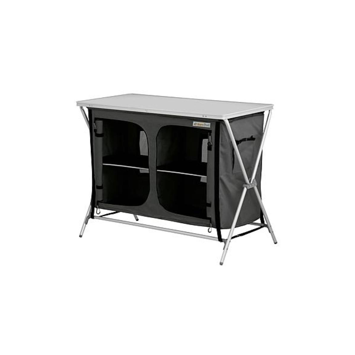 Kompakter Vorrats- und Aufbewahrungschrank mit 2 getrennten Fächern mit je 2 Ablageböden. Mit dem Cross-Faltgestell einfach aufzubauen oder auseinander klappbar. 2 Innenböden mit Alu-Randverstärkung. Eingearbeitete Lüftungsgitter an der hinteren Seite, Füsse sind einzeln einstellbar um Unebenheiten im Boden auszugleichen. Im Lieferumfang ist eine Tragetasche. 2 getrennte Fächer Lüftungsgitter hinten Füße höhenverstellbar inkl. Tragetasche Technische Daten: Maße (BxTxH): 102 x 50 x 82 cm Packmaß (BxTxH):…