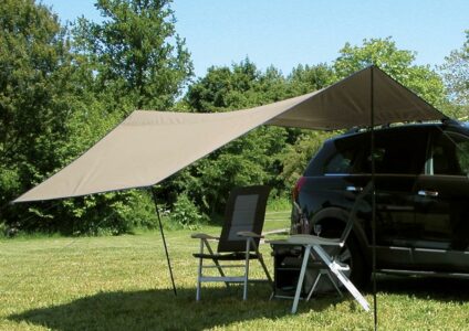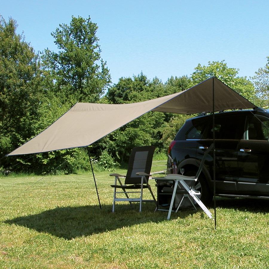 Schaffen Sie sich einen schattigen Platz vor Ihrem Kompakt-Van oder SUV. Das EuroTrail Sonnensegel ist einfach und schnell aufgebaut. Inklusive ø 18 mm Stahlgestänge, Spannleine, Winkelhering und 4 Saugnäpfe mit Haken Farbe: beige, Saum: blau Gestänge:ø 18 mm Stahl Material: 100 % Polyester 185T Maße (B x T x H):365 x 365 x 200 cm Packmaß:57 x ø 12 cm Gewicht: 2,75 kg