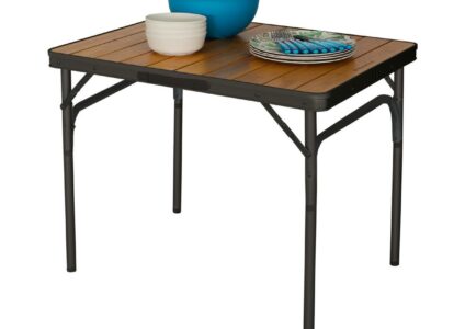 Camping Tisch mit wasserfester Bambusplatte. Robuster und stabiler Aluminiumrahmen in 2 verschiedenen Höhen und mit verstellbaren Füßen. Rahmen ist leicht zusammenklappbar. mit wasserfester Bambus-Tischplatte robuster, stabiler Alu-Rahmen verstellbare Beine und Füße zusammenklappbar Technische Daten: Gewicht: 3,7 kg Maße: 75 x 55 x 26/60 cm Packmaß: 75 x 55 x 4 cm Belastbarkeit: 50 kg Material Tischplatte: Bambus Material Rahmen: Aluminium Farbe: braun/anthrazit