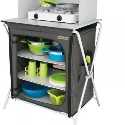 Faltbarer Küchentisch mit rollbarer Alu-Arbeitsplatte. 2 Ablageböden, Alu- Gestell mit verstellbaren Beinen Fliegengaze zur Entlüftung inklusive Windschutz und Aufbewahrungstasche Technische Daten: Farbe: grau Größe: 70x52x85 / 109cm Gefaltet in: 76x50x10cm Material: 100% Polyester Rahmen: Aluminium Top Platte: Aluminium Rolle Platte Windschutzscheibe: Stahlblech Max Belastung: 25 kg Gewicht: 8,4 kg Lieferumfang: 1 Chur Küchenschrank inklusive Windschutz und Aufbewahrungstasche