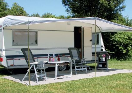 Universal Sonnenvordach für Caravan oder Vorzelt. Durch aufgenähte Verstärkungen und mitgelieferte Ösen zum einschlagen kann das Sonnenvordach auch vor einem Vorzelt angebracht werden. Produktmerkmale: Schnell auf- und abzubauen Lichtecht, reißfest und leicht Technische Daten: Material: All Weather Tex 1.7, beidseitig beschichtet (100 % Polyester) Umlaufmaß: 826-850 cm Giebelmaß: 219-230cm Dachtiefe: 240 cm Gewicht: ca. 4,5kg Farbe: grau Ohne Gestänge. Gestänge ist separat zu bestellen, falls nicht…