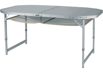 Ovaler Alu-Campingtisch mit wasserfester Oberfläche! Zusammenklappbar, jedes Tischbein ist höhenverstellbar. Die Top-Platte ist aus Aluminium also wasserfest und hitzebeständig. Praktisches Ablagenetz unter der Tischplatte. wasserfest hitzebeständig zusammenklappbar Technische Daten: Maße (L x B x H): 150 x 80 x 70/65/58 cm Packmass: 82 x 77 x 8 cm Gewicht: ca. 8 kg Material: Aluminium