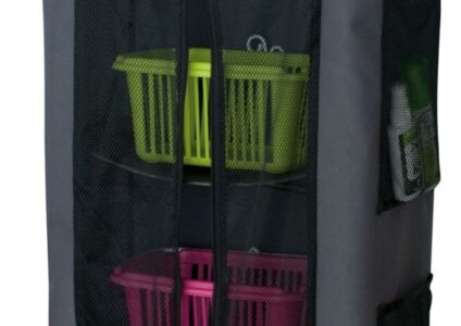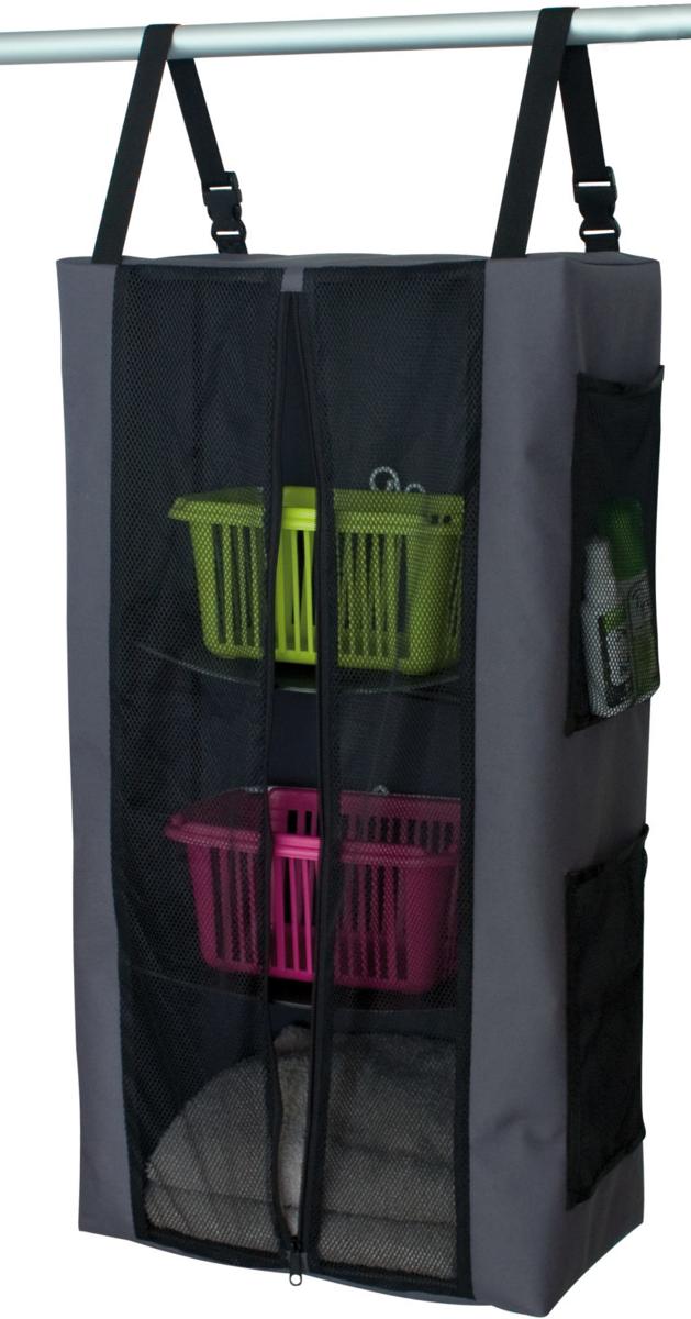Schrank mit Insektengschutzgaze, Aufhängung, 3 Ablageböden und Seitentasche. Eine sinnvolle Ergänzung zu allen Zeltschränken! Technische Daten: Material: 100% Polyester Grösse: 40 x 20 x 74 cm Farbe: anthrazit