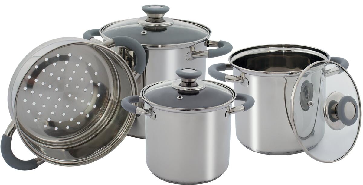 Komplettes Pfannenset inkl. Dampfgarer / Sieb aus robustem und haltbarem Edelstahl. Das Set besteht aus 3 Töpfen mit Glasdeckel und einem Dampfgarer. Die Griffe der Pfannen und der Deckelgriff bestehen aus einem hitzebeständigen Silikon. Durch die Höhe der Töpfe eignen sich diese für kleinere Gasbrenner. Die Pfannen haben einen Kapselboden und sind daher für alle Wärmequellen wie Gas, Elektrik, Keramik oder Induktion geeignet. mit Dampfgarer vielseitig einsetzbar Technische Daten: Modell: Kingston…