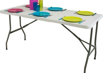 Praktischer Tisch in sekundenschnelle auf- und abgebaut. Ideal um ihn unter einem Pavillon zu platzieren. Zusammengeklappt passt er in nahezu jeden Stauraum. Dieser Tisch ist für den Dauereinsatz geeignet. Die Tischplatte aus Kunststoff (HDPE) ist zu 100% wasserdicht und UV-beständig. für den Dauereinsatz geeignet wasserdicht UV-beständig Technische Daten: Gestell: Stahl Farbe: weiß/dunkelgrau Maße (L x B x H):180x 75 x 75 cm Gewicht: 14,8 kg Lieferumfang: Campingtisch