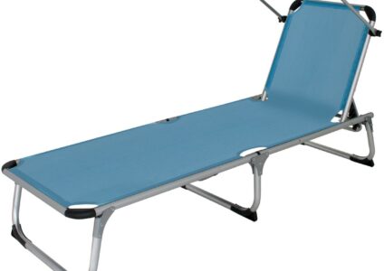 Wetterfeste komfortable Liege mit 5 fach verstellbarem Kopfteil und Sonnenschutz. Das stabile Aluminium Gestell ist einfach zusammen zu klappen. Der Sonnenschirm kann so eingestellt werden,das die Sonne keine Chance hat. verstellbares Kopfteil Sonnenschutz Technische Daten Bezug: Textilen (70% PVC, 30% PES) Gestell: Aluminium Gestell Größe: 188 x 57 x 30cm Packmass: 79 x 59 x 16cm Gewicht: 5.9 kg Max. Belastung: ca. 120 kg. Material: 100% Textilene Farbe: Blau Lieferumfang: Liege