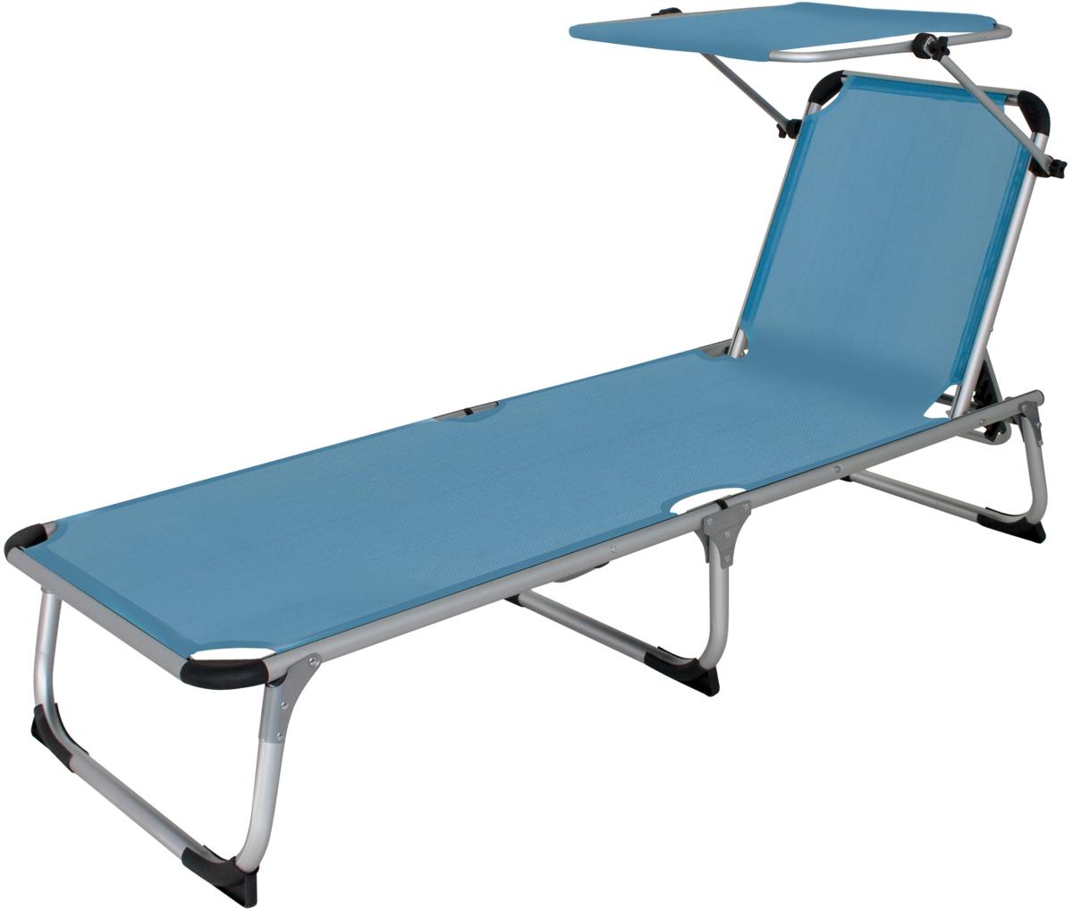 Wetterfeste komfortable Liege mit 5 fach verstellbarem Kopfteil und Sonnenschutz. Das stabile Aluminium Gestell ist einfach zusammen zu klappen. Der Sonnenschirm kann so eingestellt werden,das die Sonne keine Chance hat. verstellbares Kopfteil Sonnenschutz Technische Daten Bezug: Textilen (70% PVC, 30% PES) Gestell: Aluminium Gestell Größe: 188 x 57 x 30cm Packmass: 79 x 59 x 16cm Gewicht: 5.9 kg Max. Belastung: ca. 120 kg. Material: 100% Textilene Farbe: Blau Lieferumfang: Liege