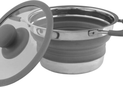 Pfanne ist hergestellt aus Silikon und Edelstahl. Die Griffe sind mit Silikon geschützt. Der Deckel hat einen Silikongriff, Silikonrand und spezielle Dampf-Öffnungen. Einfach zusammen zu falten und Platzsparend. Ideal für den Einsatz im Wohnmobil, Zelt oder zu Hause. BPA freies Material einfach zusammen zu falten spülmaschinengeeignet Technische Daten: Volumen: 3,5 Liter Material: Silikon / Edelstahl Deckel: Glas Maße: Ø 24 x 12,5 cm Maße gefaltet: Ø 24 x 4,5 cm Gewicht: 1,1 kg Farbe: grau