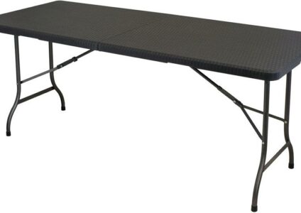 Der Tisch hat eine 100 % wasserfeste Platte in einem schönen Rattandesign. Die Platte lässt sich leicht reinigen, da sie eine geschlossene Oberfläche hat. Der Aufbau ist durch das vormontierte Gestell sehr schnell und einfach. Das Gestell verschwindet beim Abbau in der Tischplatte, es kann nichts verloren gehen. Der Tisch wird in der Mitte gefaltet und hat damit ein kleines Packmaß. Ein integrierter Griff erleichtert den Transport. leicht zu reinigen einfacher Aufbau kleines Packmaß Technische Daten…