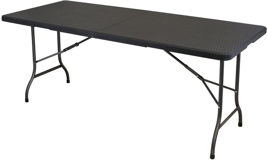 Der Tisch hat eine 100 % wasserfeste Platte in einem schönen Rattandesign. Die Platte lässt sich leicht reinigen, da sie eine geschlossene Oberfläche hat. Der Aufbau ist durch das vormontierte Gestell sehr schnell und einfach. Das Gestell verschwindet beim Abbau in der Tischplatte, es kann nichts verloren gehen. Der Tisch wird in der Mitte gefaltet und hat damit ein kleines Packmaß. Ein integrierter Griff erleichtert den Transport. leicht zu reinigen einfacher Aufbau kleines Packmaß Technische Daten…