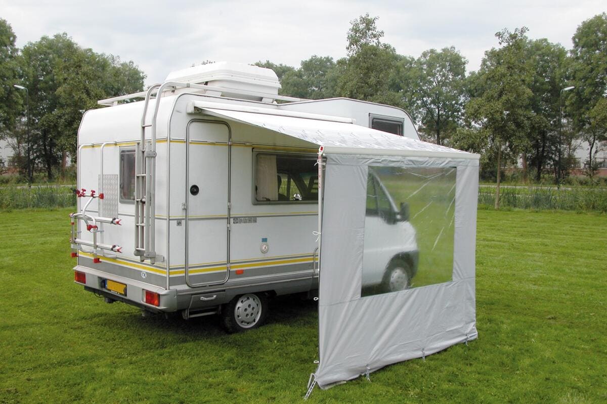 Universele Markisen Vorderwand mit Fenster. Einfache Montage mit Keder an der Unterseite der Markisen verwenden. inkl. Abspannleinen , Heringe und Aufbewahrungstasche Technische Daten: Farbe: grau Größe: 350cm Maße: 334x190cm Material: 100% Polyester All Weather Tex Gewicht: ca. 5 kg Lieferumfang: 1 Universal Vorderwand