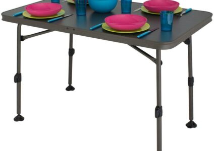 Campingtisch mit verstellbaren Beinen. Die Tischplatte aus Aluminium ist wasserdicht und für den Außenbereich geeignet. Tischbeine mit breiten Schalenfüßen sorgen für bessere Stabilität und verhindern das Absacken des Tischs. Farbe: bronze Belastbar bis: 30 kg Höhenverstellbar: 55 – 78 cm Material Gestell: Alu-Rundrohr Breite: 80 cm Höhe: 78 cm Tiefe: 60 cm Nettogewicht: 6 kg