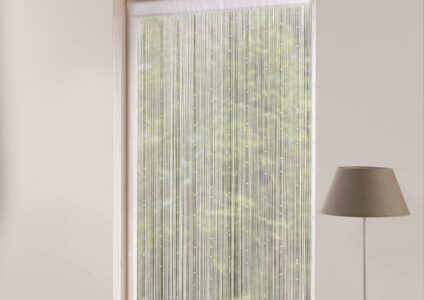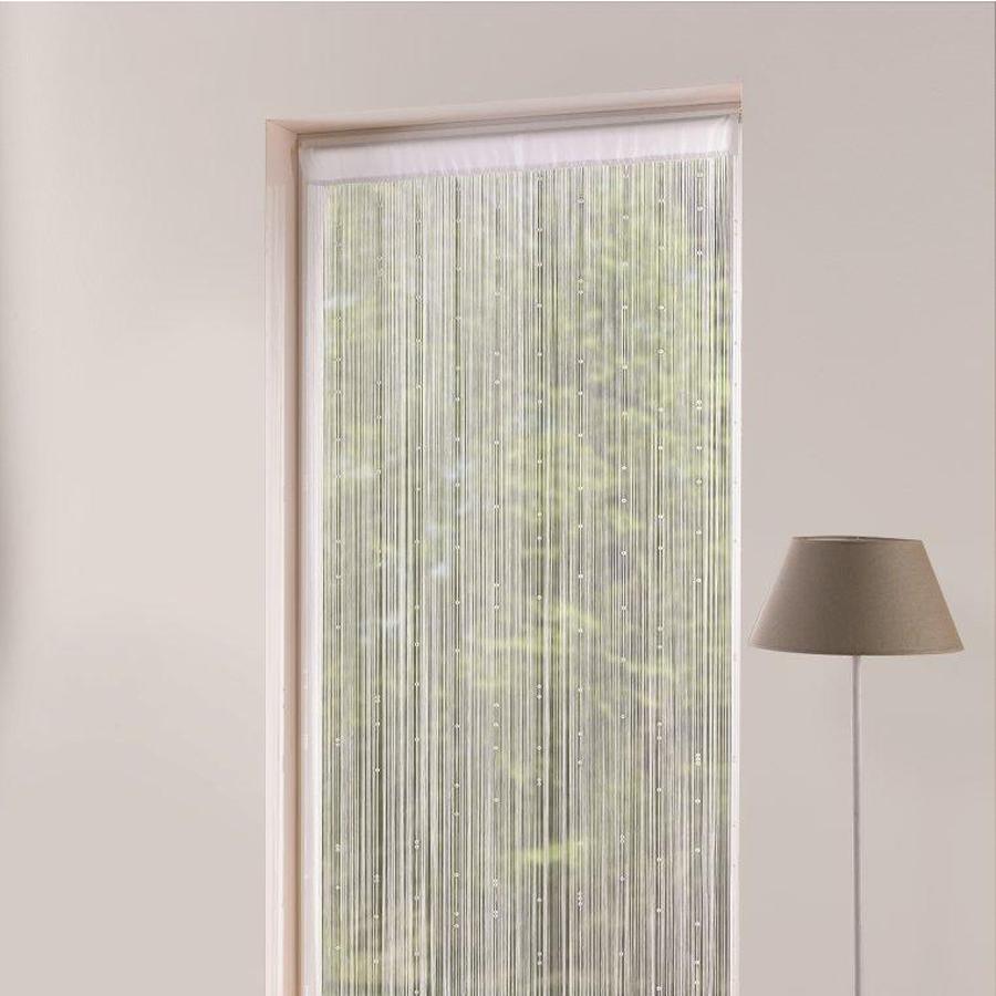 Eng aneinander gereihte Polyesterfäden an durchscheinender Borde zusammengefasst, Fäden dekorativ bestückt mit schimmernden, weißen Perlen, fensterfertig konfektioniert für Stangendurchzug, 100 % Polyester.